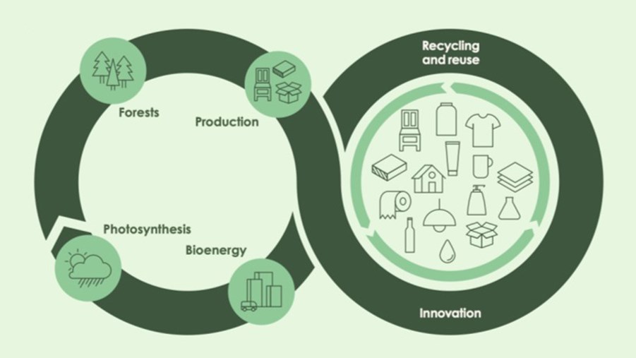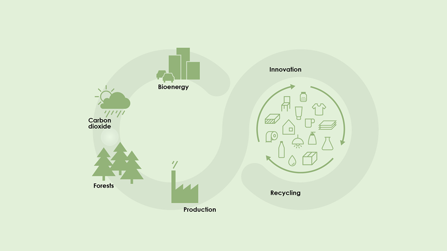 Forest-based products are part of a natural, circular ecocycle that begins and ends with photosynthesis. Active forest management and the products from the forest create the conditions for a closed loop that absorbs, binds and sequesters carbon dioxide.