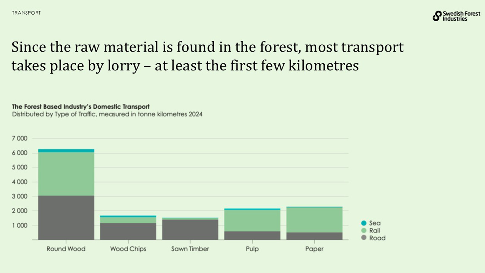 The forest industry is Sweden’s largest transport purchaser, as shown by the statistics presented here. The industry carries out short- and long-distance transports, the former by road and rail and the latter by sea. The industry’s efforts to reduce transport emissions include the maximum utilisation of rail transport and the electrification of road transports.
