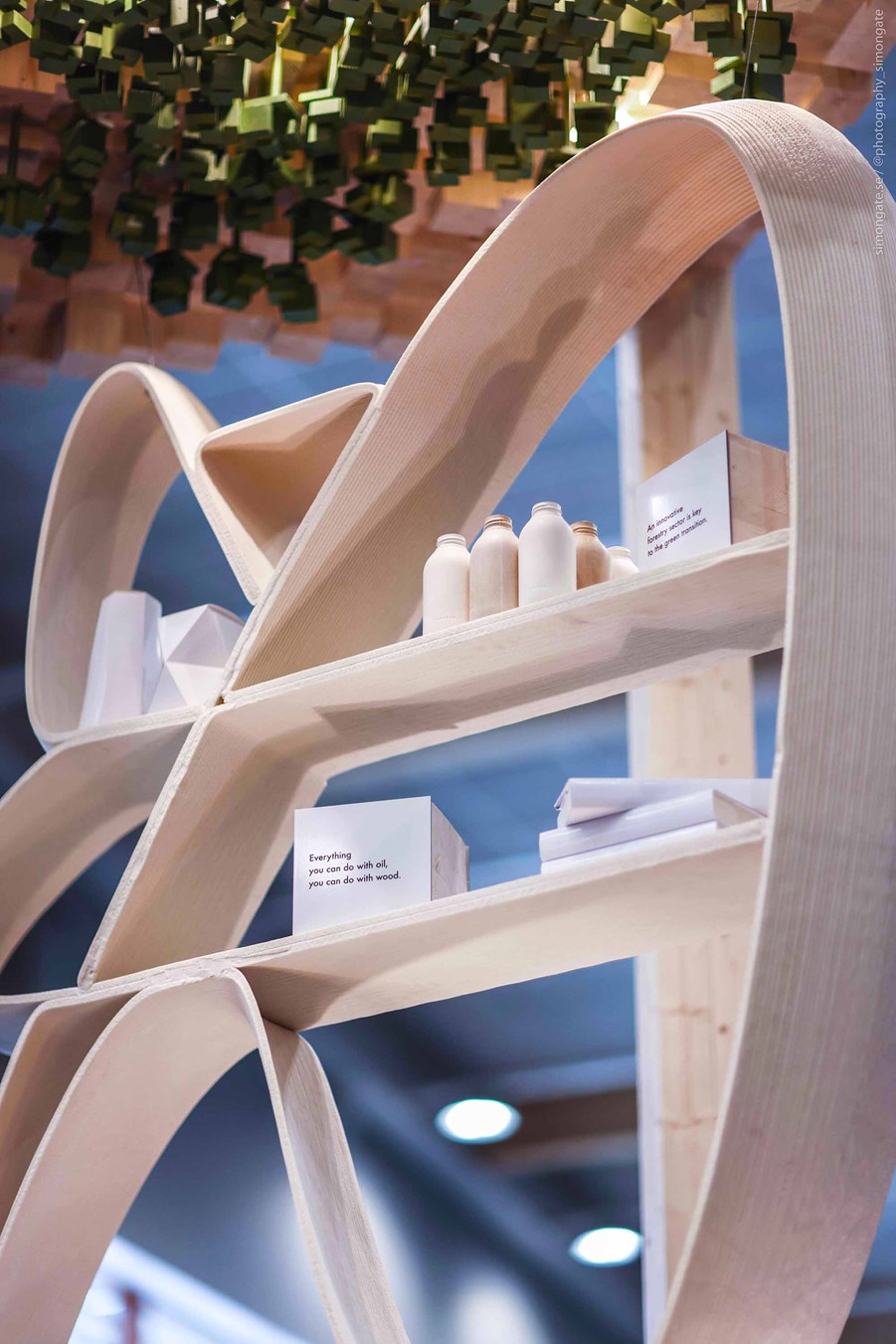 Most of the exhibition is built from glulam from Swedish sawmills. They are combined with led screens that convey the forest-based industry’s central role in the green transition with images and video.