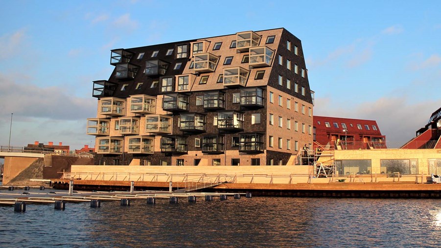 Kilströmskaj in Karlskrona, southern Sweden, is a development of three apartment buildings with a total of just over 40 apartments. Due to their special construction, the buildings meet standards for passive buildings. Due to the special architectural design, many of the buildings’ walls also serve as ceilings. This places demands on the buildings’ climate shells and therefore cedar shavings dyed in red, black and grey are used, making the facades durable and maintenance-free.